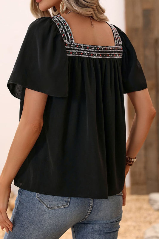 V-Neck Lace Detail Flounce Sleeve Blouse