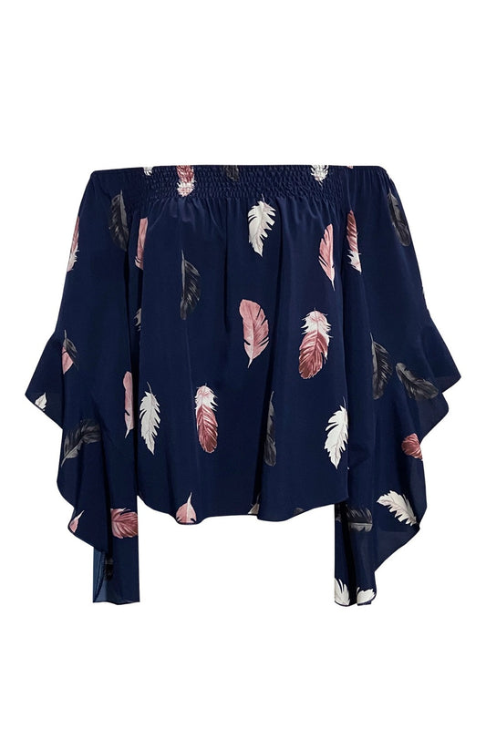 Feather Print Smocked Off-Shoulder Blouse