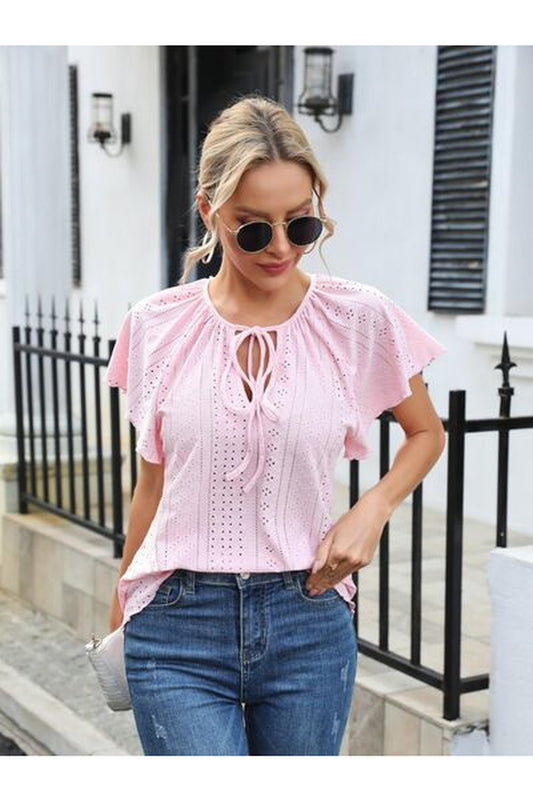 Eyelet Tie Neck Flutter Sleeve Blouse