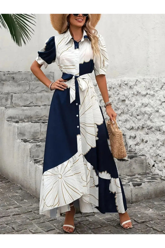 Printed Tie Waist Half Sleeve Maxi Shirt Dress