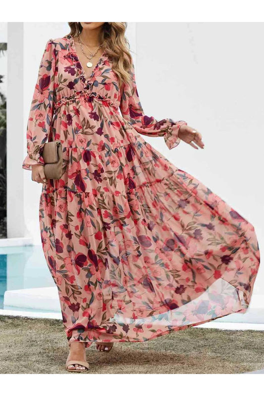Playful Frill Printed V-Neck Flounce Sleeve Dress