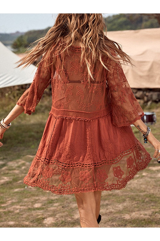 Openwork Backless Flare Sleeve Cover-Up Dress