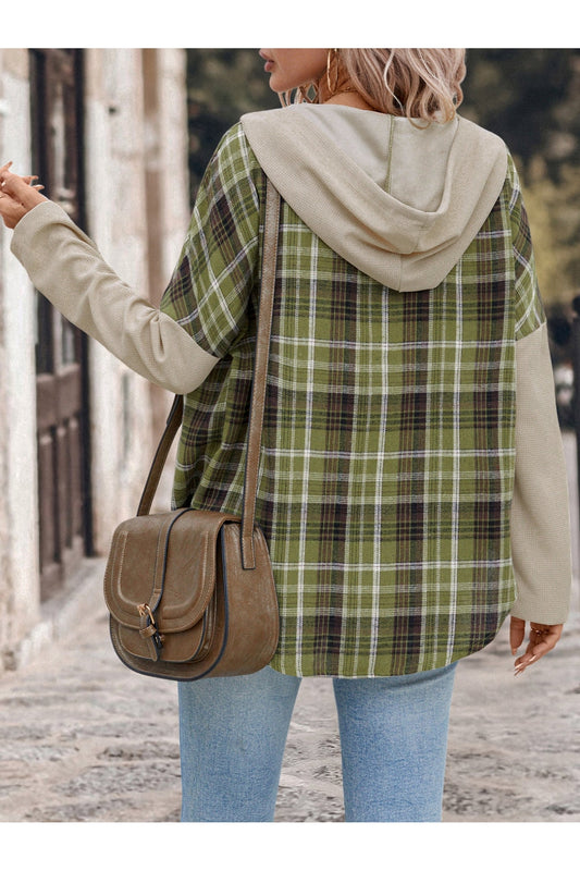 Perfee Drawstring Plaid Hooded Shirt